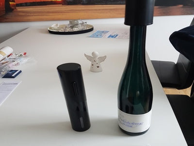 "El sacacorchos eléctrico funciona perfecto, y se ve elegante en la cocina. Muy buena compra."